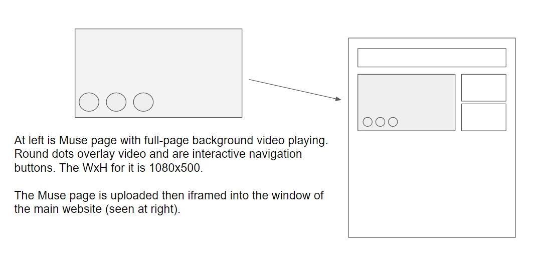 I made a Muse page with full page video background and interactive buttons on top of it. It works great. The video is 1280x720 and the Muse page is 1080x500, the same size as the main website that the Muse page is iframed into it. See image below.