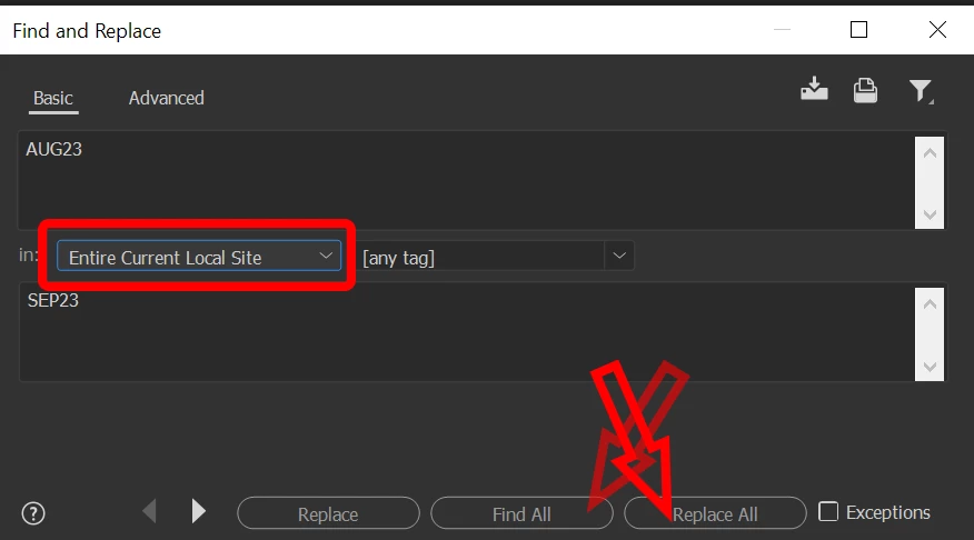 When using FIND AND REPLACE IN FILES facility, I find I only change the currant page i am on.