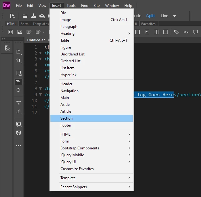 Adobe dreamwaver 2020 sürümün de 'bölüm' etiketini nasıl bulabilirim?