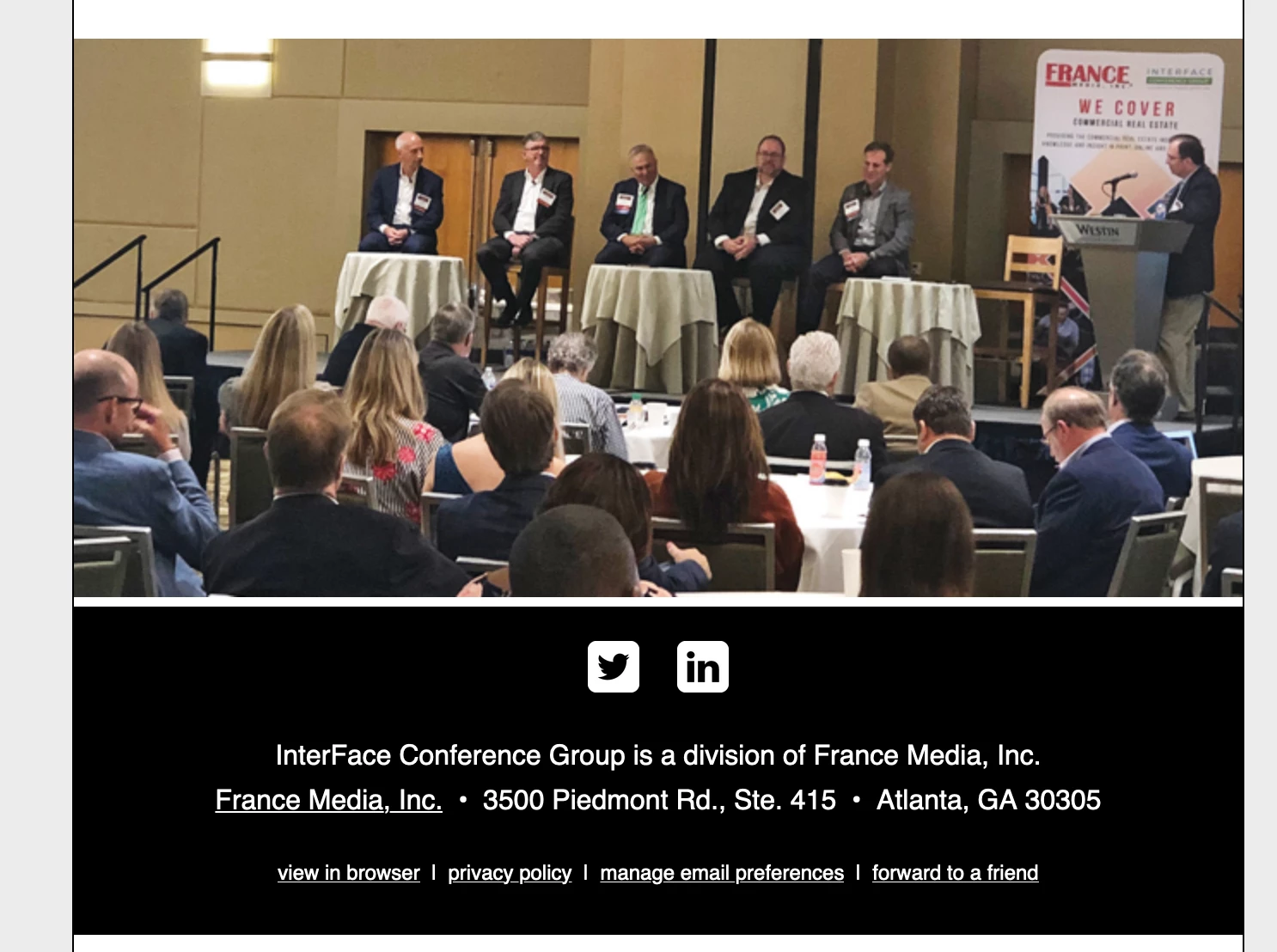 <p>InterFace Conference Group is a division of France Media, Inc.<br><a href="http://www.francemediainc.com">France Media, Inc.</a> • 3500 Piedmont Rd., Ste. 415 • Atlanta, GA 30305</p>