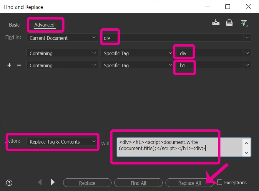 and Replace with: