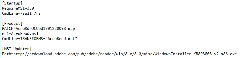 - msiexec /i "AcroRead.msi" TRANSFORMS="AcroRead.mst" PATCH="\\<Deployment Share File Path>\AcroRdrDCUpd1701220098.msp" /q