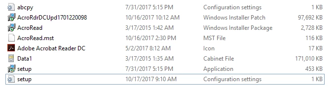 - This tells me that my application is only installing the patch (AcroRdrDCUpd1701220098.msp) instead of the .msi followed by the .msp. As such, the installed application does not include the custom settings which I configured for it in the AcroRead.mst.