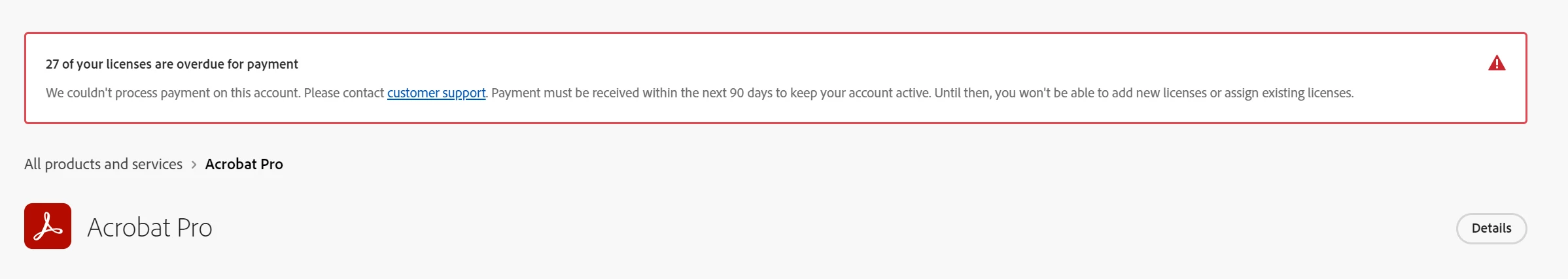 We are recieving the following error messages that licenses are overdue for payment which is clearly false. Because of this error message all users in our organization cannot utilize any of the Acrobat features and Creative Cloud. This has been occurring since we made our payment last month. Now a month later we cannot utilize any features that we paid for due to this error. A ticket was submitted by Adobe Support (ADB-30739110-R4X6). The first representative I spoke with stated that we would get a call back from the Senior Engineers in 24 hours. I waited over 24 hours, call and spoke with another representative and they stated the issue would be resolved in 48 hours and I would get a callback from a Senior Engineer. It's been 48 hours, and as I'm typing this I got a reply from a representative stating the inconvience of Adobe Admin Portal issue. I appreciate the response, but this is impacting our organization. We don't need apologies, we need results, and we need a resolution fast.