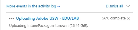 Recenlty I was packaging the adobe package from the AdminConsole, transformed into a intune file, but when I'm uploading the file, it never crosses the 56% mark, I was checking and it looks like the WIN32app is 30GB according to the intune documentation.