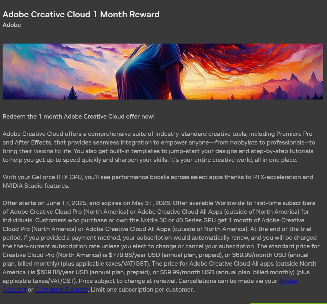 Based on your message, it appears you're attempting to redeem a one-month Adobe Creative Cloud reward provided by NVIDIA and getting an error.
