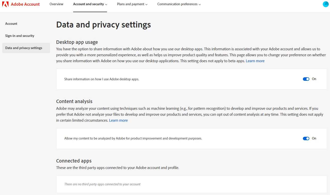 I have a problem with Adobe "Data and privacy settings" https://account.adobe.com/privacy The entries for "Desktop app usage" and "Content analysis" are not available for all users of our company. If I log in with a my private Adobe profile, then the settings are visible. How can I make my privacy settings available?