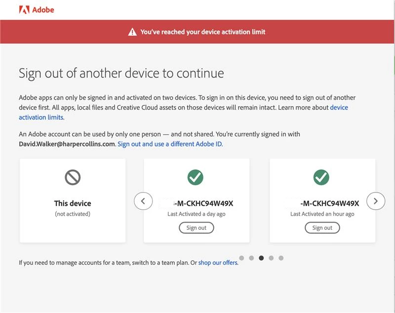 Hello! We are getting multiple pops up from the Creative Cloud app indicating the same computer is active in the Device Limitation screen. Its not a big deal, for now. All we have to do is just sign out of one and Adobe still works as expected. Just thought we'd let you know this is happening in case it becomes a bigger issue. Let us know if you need any other info.
