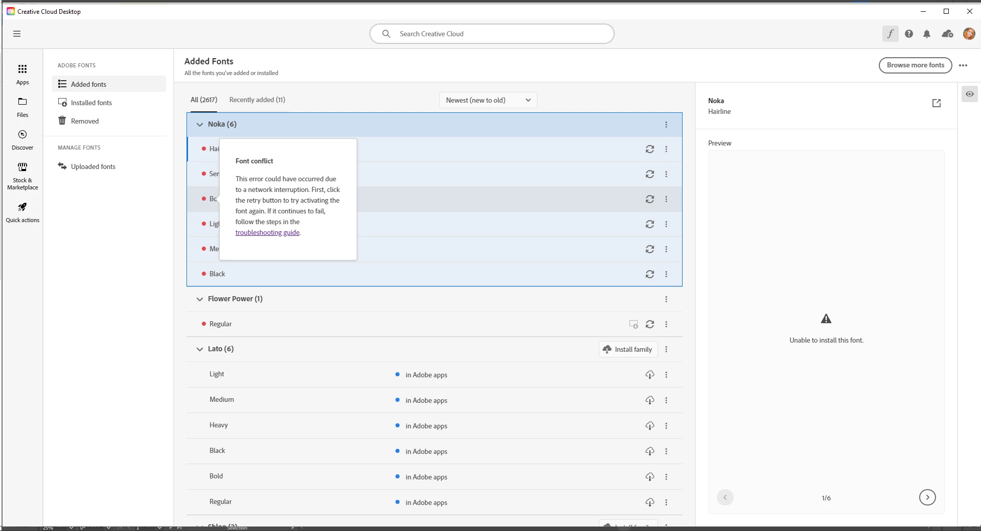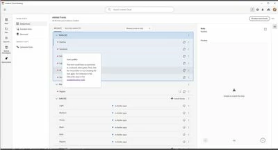 Has anyone experienced this error on fonts.adobe.com? (photo below) I am trying to preview and download Adobe Fonts, and am unable to. I do have an active account, my pervious downloaded fonts are available, and I have logged out of my account, restarted my computer and logged back in to try and resolve. But it did not work. I have also cleared all of my browsing data/cookies and tried different browsers. At this point I am at a loss, any advice would be appreciated. Thank you!