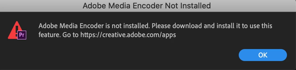 I recently updated Premiere Pro and Media Encoder to the 2020 version. However, when I try to export a video from Premiere to Encoder I get an error message that says, "Adobe Media Encoder is not installed. Please download and install it to use this feature."