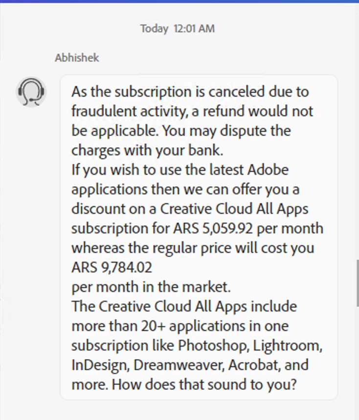 I bought Adobe to use, but they suddenly canceled my package for no reason. When I contacted them they just said it was fraud, but I didn't do anything wrong. I bought the plan, added my teammates, and that's it, but they canceled my plan for no reason.