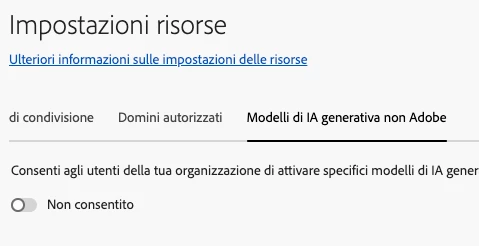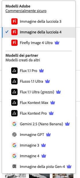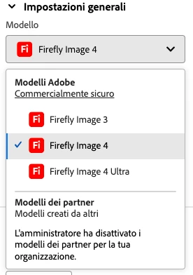 Questo invece è quello che appare quando usiamo Firefly LOGGATI con l’utente Adobe: come vedi i modelli di generazione di terze parti NON appaiono