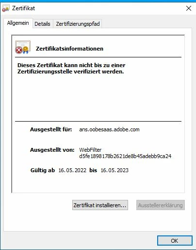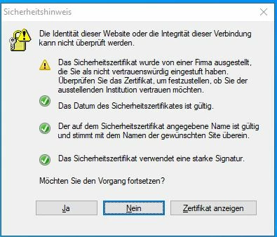 Bei dem erscheinenden "Zertifikatsfehler" ist auch kein Zertifizierungspfad einsehbar. Leider wissen wir hier nicht weiter und können nicht erklären woher diese Meldung kommt.