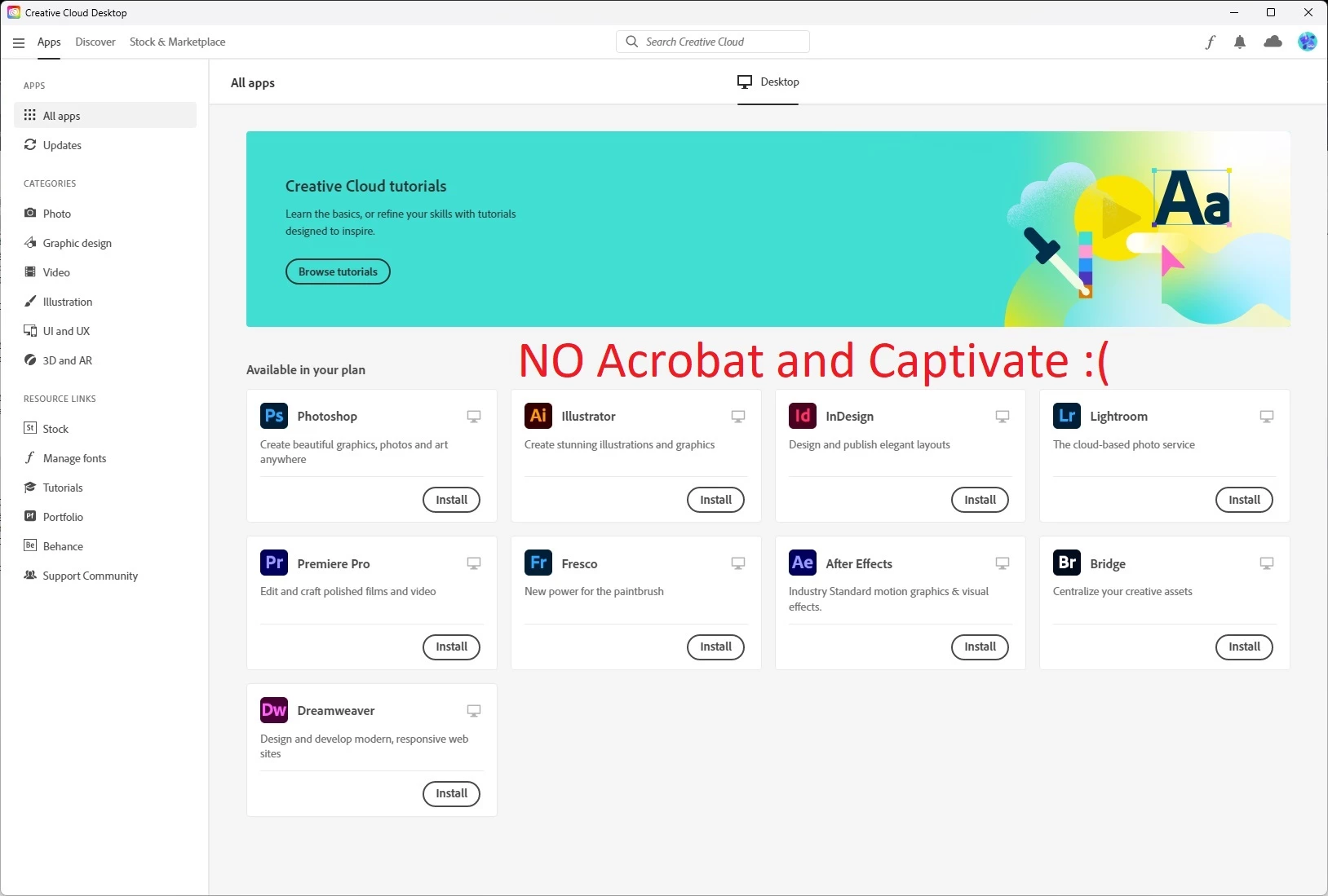 But there are no codes for Acrobat and Captivate, and when I distribute AdobeUpdater.Overrides to users, they can't install Acrobat or Captivate apps from the Creative Cloud Desktop App.