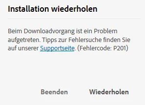 I tried to install Adobe Cloud / Photoshop, but everytime I've tried I got the Same error code: P201 (1)