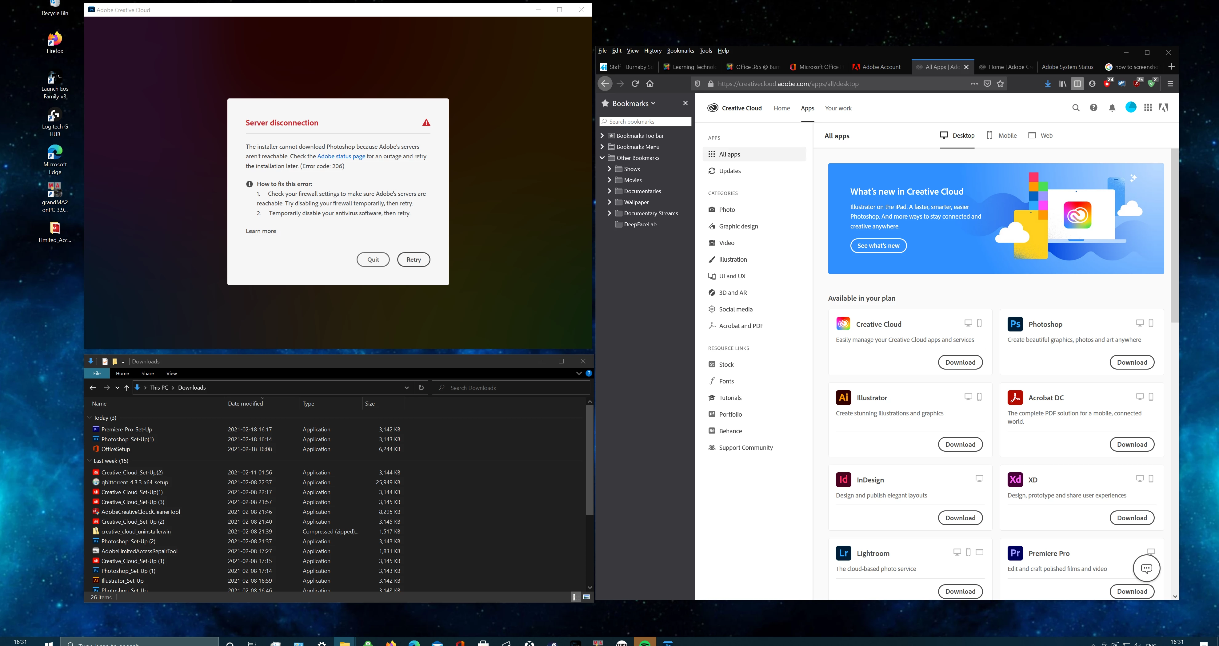 My husband and I have been trying to install Adobe Creative Suite onto both sides of our personal computer's Mac/PC Partitioned computer. On the Mac side all went smoothly, but on the PC side we can successfully log into the Adobe account, and download the Set-Up files, but when trying to actually engage installation, we get the error message as pictured here: Server disconnection.