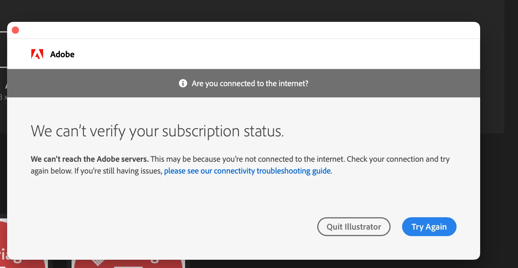 Can't verify subscription status but only for Illustrator (on Mac)