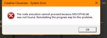 After installing the Visual C++ redistributables, if Creative Cloud still does not function properly, use the Adobe Creative Cloud Cleaner Tool to completely remove all Adobe applications and Creative Cloud files from your system: https://adobe.ly/3GxgzRR