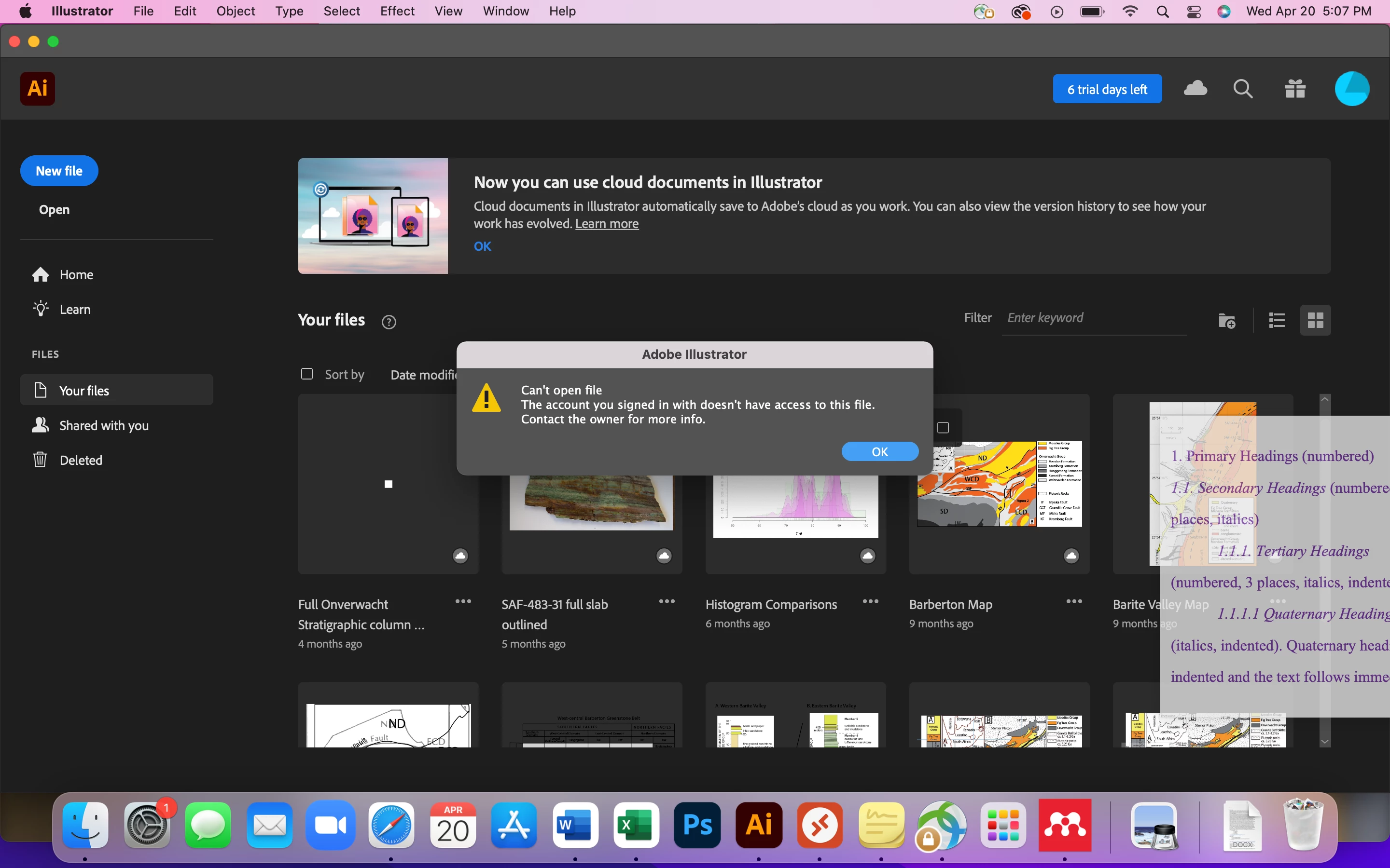 I made some illustrator files several months ago and saved them to the cloud. Now I am trying to open them and it says "Can't open file. The account you signed in with doesn't have access to this file. Contact the owner for more info." I am the original creator and I have an adobe account using one email that has both a personal account and a school account (which I can't remember if I've ever used this). The files appear in-app under "Your files" but if I go to assets.adobe.com it says "You have no cloud documents." Since I made them I've gotten a new computer and my original subscription ended and I am currently on a 7 day trial on my personal account. Also I'm a student and my institution paid for the subscription originally. I don't remember if I made the files after being signed into a personal account or a school account. When I'm signed into my school account if I try to go to assets.adobe.com I get: "Error 401: Unauthorized. You are not authorized to access this site." I'm just trying to make small changes to these files and recreating them from scratch would take weeks. 😞