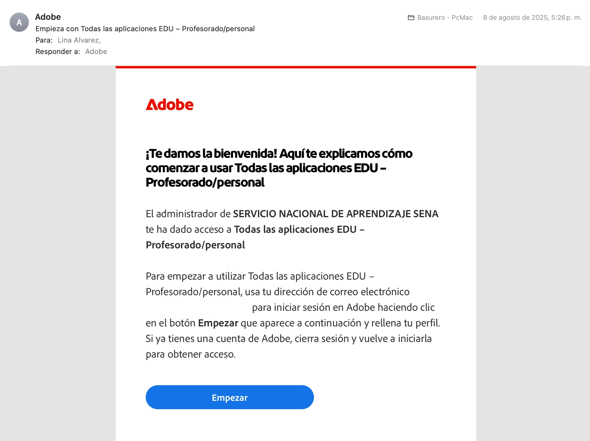 “¡Bienvenido! Aquí le mostramos cómo comenzar con Todas las Aplicaciones – Edición Pro – Profesorado/Personal. El administrador del SERVICIO NACIONAL DE APRENDIZAJE SENA le ha otorgado acceso a Todas las Aplicaciones – Edición Pro – Profesorado/Personal, que incluye créditos generativos de Adobe Firefly y descargas ilimitadas de recursos estándar de Adobe Stock.”