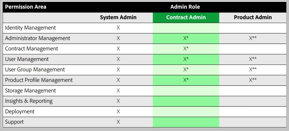 The contract admin role, a new admin role in the Adobe Admin Console that allows customers to grant administrative capabilities relative to specific contracts and their associated products to only those explicitly assigned users, is now available to all enterprise customers. The introduction of the Contract admin role allows the definition of one or more users who have permission to manage contract information, owners, and associated products for their organization for only contracts to which they are assigned.