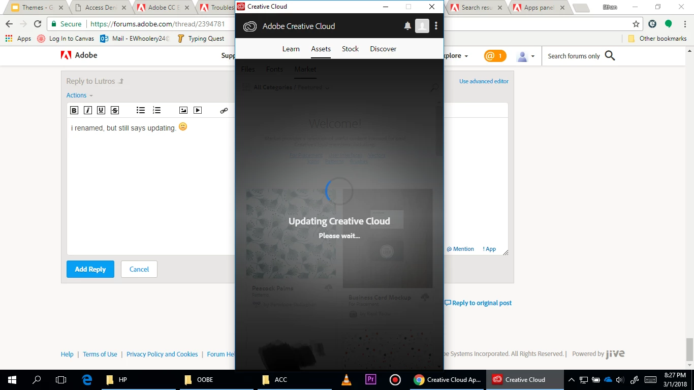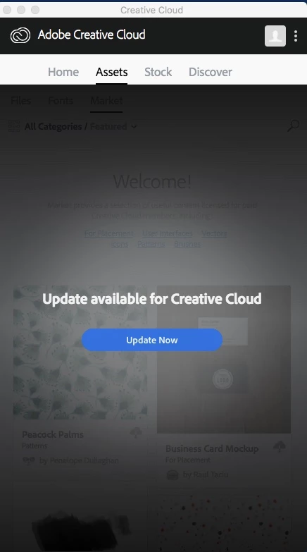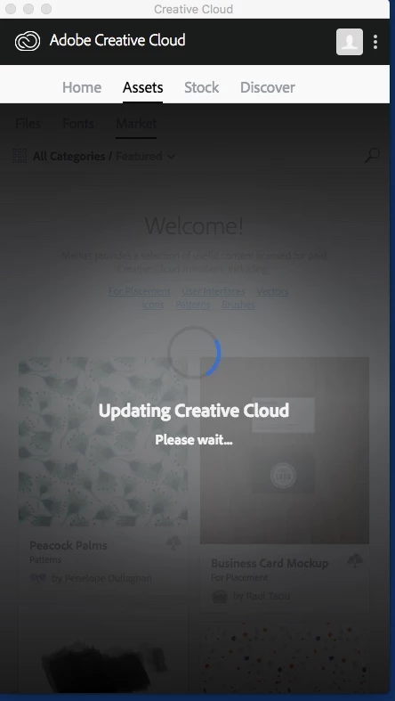 I have recently updated my creative cloud application to version 4.3.0.256 - upon signing in the assets tab has a red indicator and upon selecting the assets tab you are presented with a message that an update is available for creative cloud. Upon doing this is just sits there updating and not ever finishing..