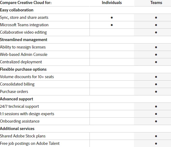 CREATIVE CLOUD FOR TEAMS – Ideal for small to midsize businesses and departments. The Creative Cloud for teams plan includes Team website, premium fonts, and 100GB of cloud storage for collaboration, plus centralized administration, flexible deployment, enhanced collaboration, and business-level support.