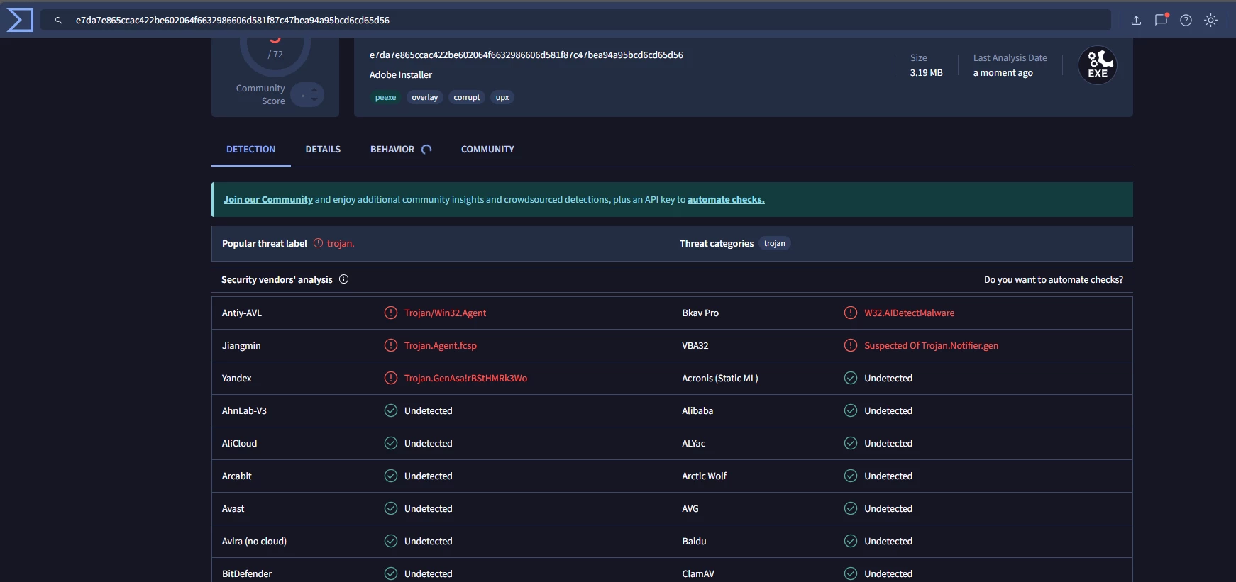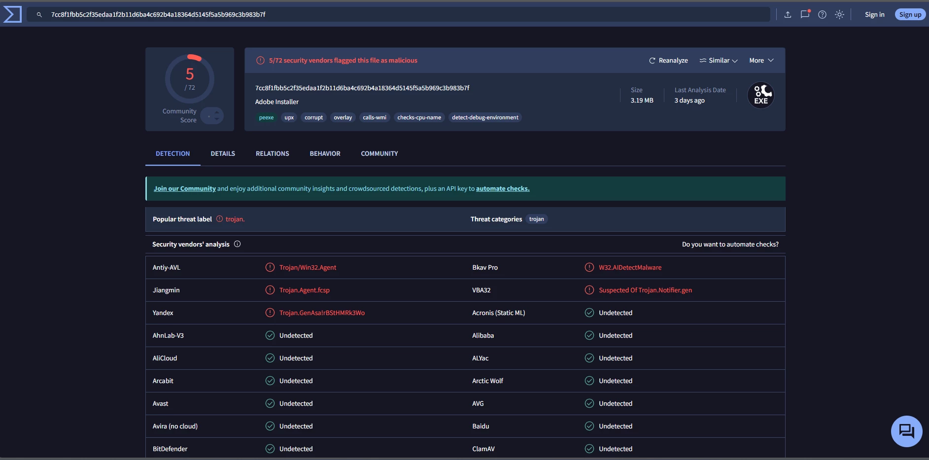 Bom dia, gostaria de saber por que o instalador de configuração da Creative Cloud contém vários vírus? Já que baixei diretamente do site oficial da Adobe e não apenas de um instalador, mas de todos eles, e o interessante é que nem sempre é quando você adiciona o arquivo ao site do Total Virus que os resultados são revelados, como no meu caso eu só consegui uma vez e depois não consegui sair da página CAPCHA, o que é estranho para quem é contra o download de software pirata por causa de vírus, e seu instalador contém 5 vírus de acordo com o Total Virus.