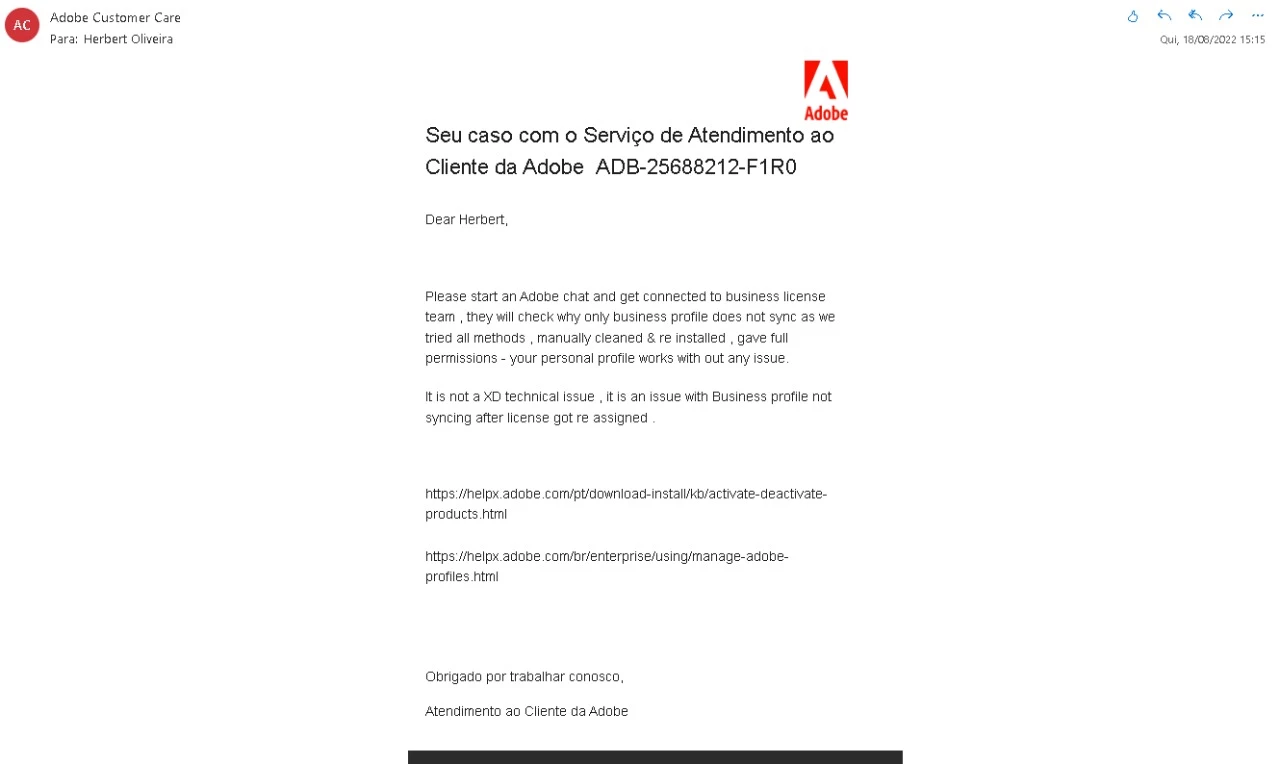 On Monday (15/08/2022) when I went to open my Adobe XD to work, I realized that the license was expired, I asked the company I work for to adjust the license and the next day it was renewed. However, Creative Cloud could no longer sync with the files shared by my work team, always showing the file sync error. I have since contacted Adobe and 3 operators and 2 technicians have remotely accessed my computer and have not been able to resolve the issue. I was only informed that it was not a problem with the computer or Adobe XD, but with the license registration. I'm still unable to work for a week and no resolution to the case.