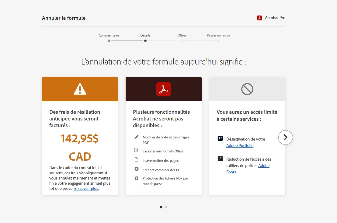 je souhaiterai savoir s'il est possible de mettre fin a un abonnement qui a été effectué en double pour un meme produit (Adobe Acrobat Reader) et pour un seul utilisateur même Business ID, sans que des frais soient appliqués après la résiliation ?