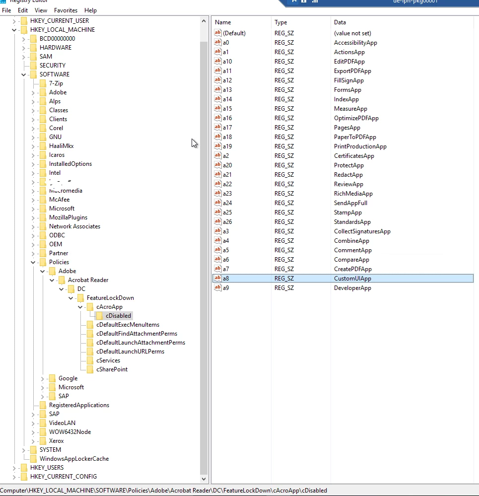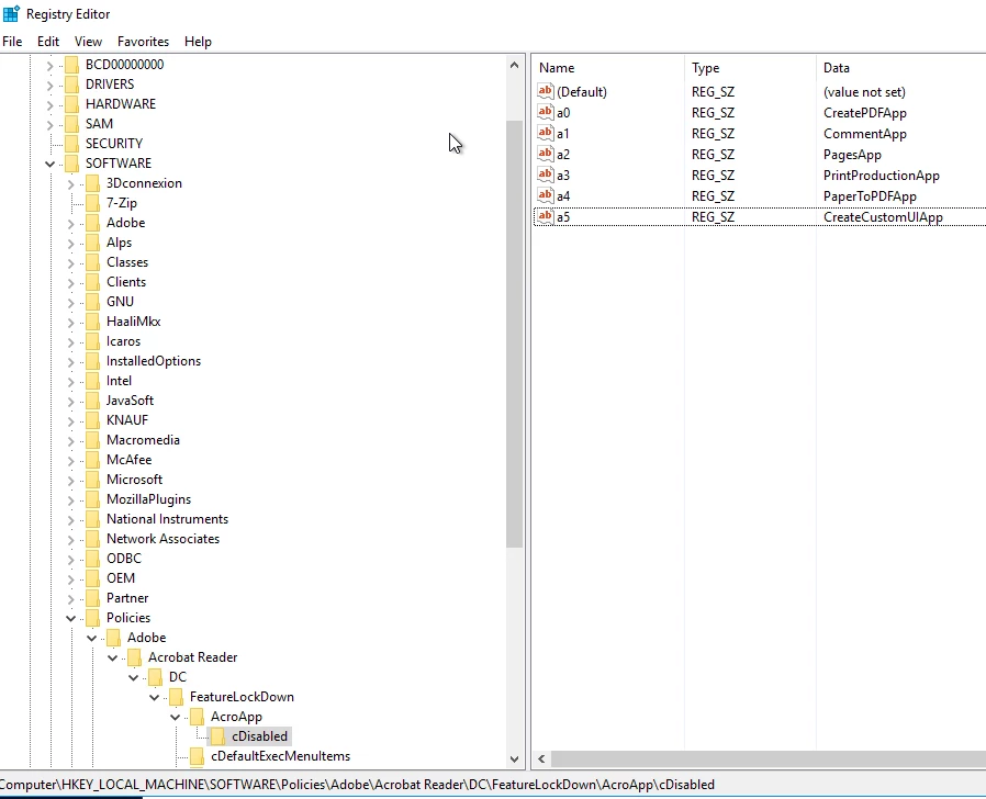 [HKLM\SOFTWARE\Policies\Adobe\<product name>\<version>\FeatureLockDown\AcroApp\cDisabled]
