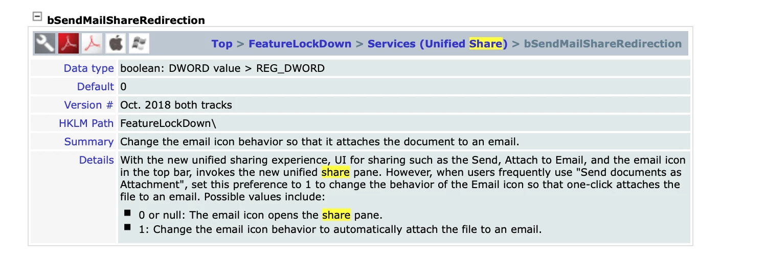 Thank you for sharing your requirement, and apologies for the delay in response. If you are looking to change the email icon behavior so that it attaches the document to an email for all devices in your organization, please refer to the following documentation: https://adobe.ly/46tOVP4
