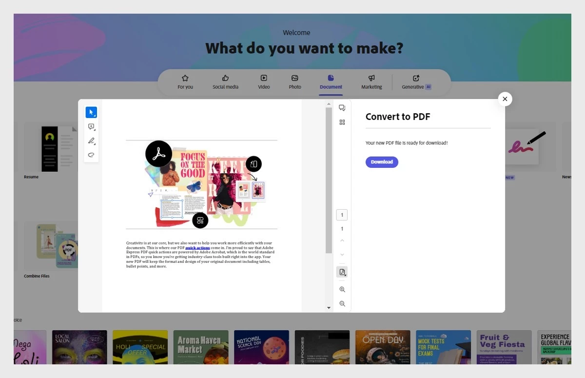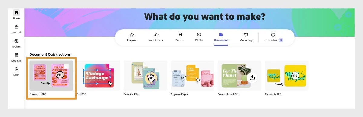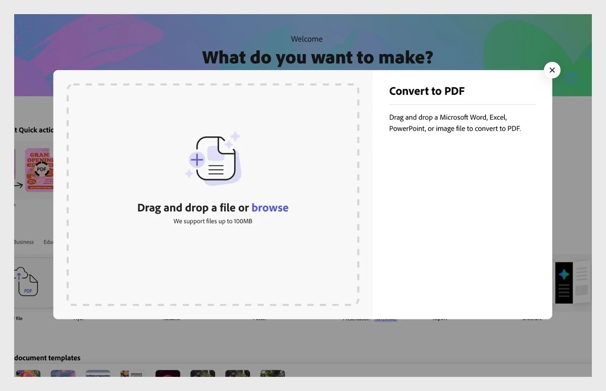 Convert any file to PDF with ease using Adobe Express PDF features. From images to spreadsheets and presentations, access quick options anytime, anywhere. Stay productive at home, in the office, or on the go.