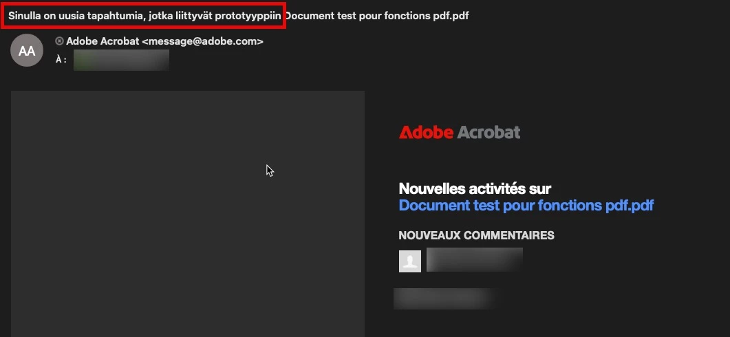 When I use the @ fonction to share a comment with another user, the email title is in Finnish (wrong) and the email body is correct in french :