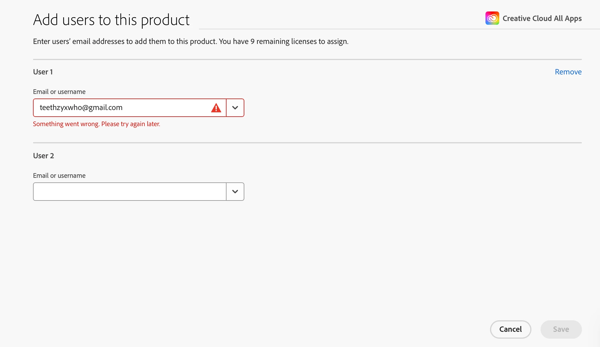 ERROR WHEN ADD USERS TO PRODUCT : " Something went wrong. Please try again later. "