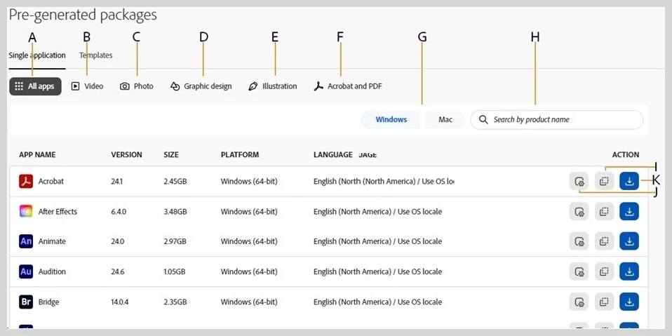 You can now download single-app packages from the Adobe Admin Console. Single-app packages each contain the latest version of a single Creative Cloud app, for example, Photoshop or Premiere Pro.