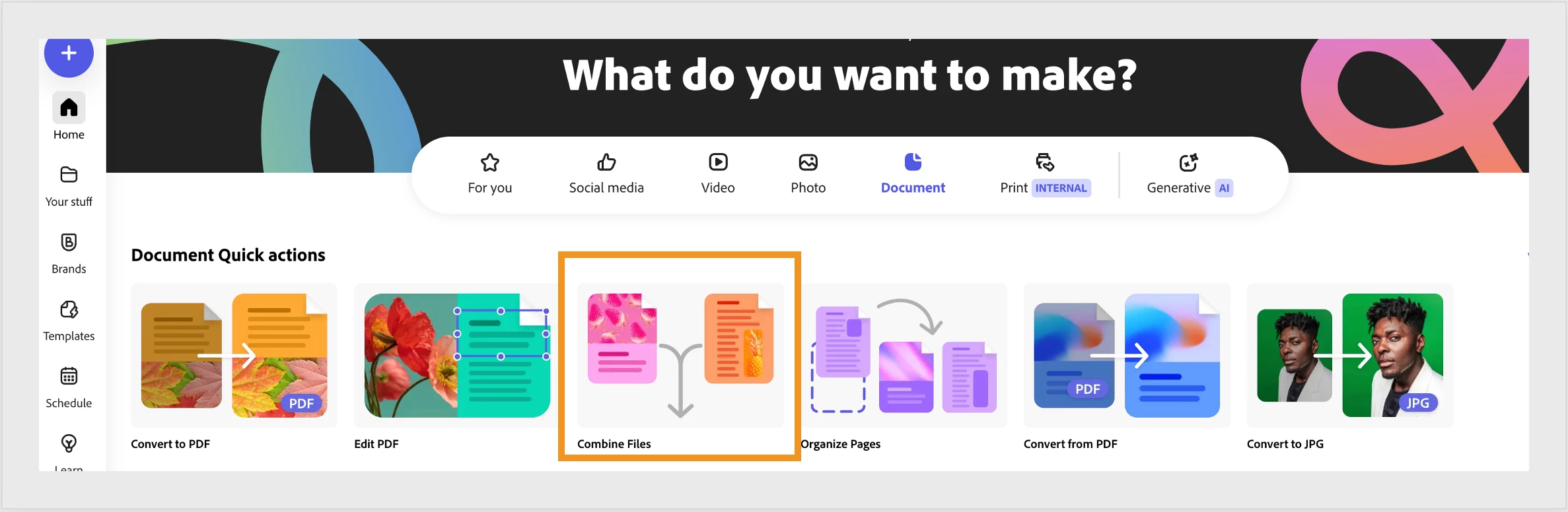 Use Adobe Express PDF features to combine and create a single PDF by combining files in various formats that started out in different programs. Access quick options anytime, anywhere to combine a PNG photo, an Excel spreadsheet table, or a few Word documents.. Stay productive at home, in the office, or on the go.