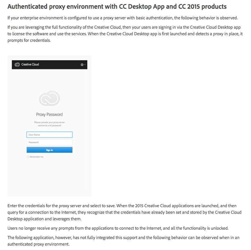 Thanks, alisterblack. This link is about preventingOur problem has been more similar to the original poster's issue, where when the user provides proxy credentials, and then has to change their proxy password (in Network proxy preferences) due to corporate requirements. We were looking for a way to immediately update Adobe's own "record" of these credentials. Otherwise, a while after the proxy password change in Network preferences, we either get messages in the CC app that the adobe servers cannot be reached, or we may get another proxy popup request, but it doesn't always seem to save to the keychain. Sometimes it seems like Adobe is "pounding at the doors" of the proxy server behind the scenes, because we've even had situations where the user ends up locked out of their corporate account due to too many "attempts". So changing proxy passwords has been a bit dicey for us (and I don't like the idea of users having to dig out obscure files from the Library).