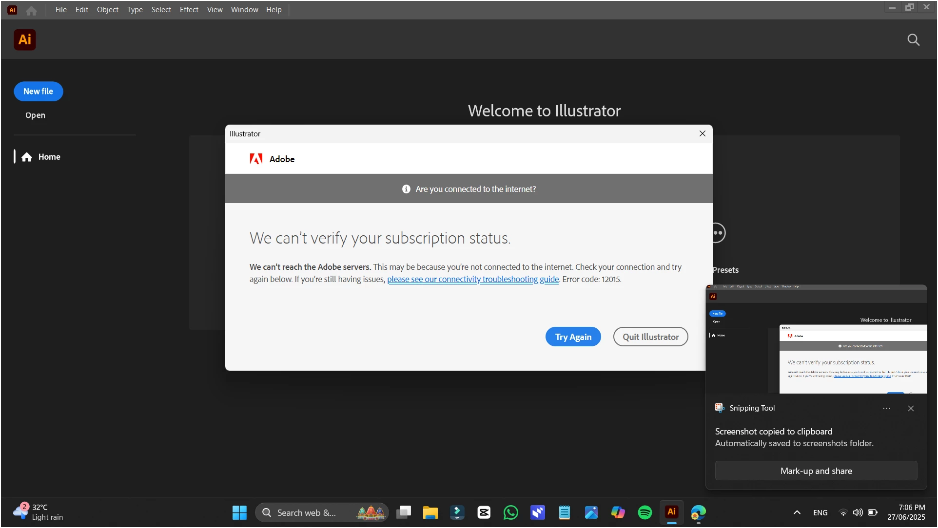This is a network connectivity issue when the app occasionally fails to connect with Adobe servers and runs into this error.