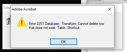 I came across an issue installing the latest Adobe Acrobat DC patch 22.003.20258. It appears that the attempt to rebrand the shortcuts from Adobe Acrobat DC to Adobe Acrobat causes the application to fail if certain customizations were made to the Acrobat DC installation. In my case, the problem was that when Adobe Acrobat DC was customized (using the Customization Wizard) the Distiller shortcut was removed. When the patch is being applied, the following error was displayed: