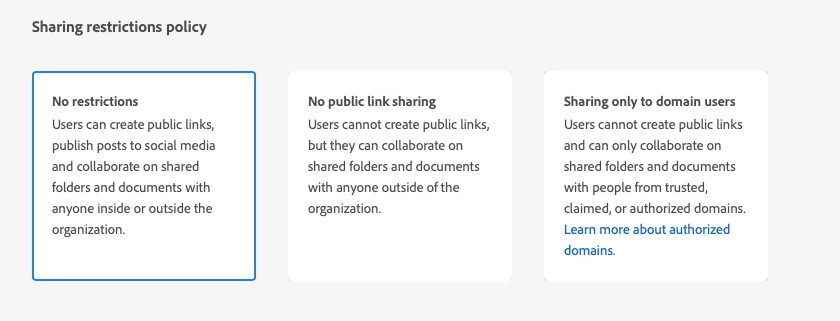 - Full admin control to disable social sharing capabilities via the Admin Console "Sharing Restriction Policy"