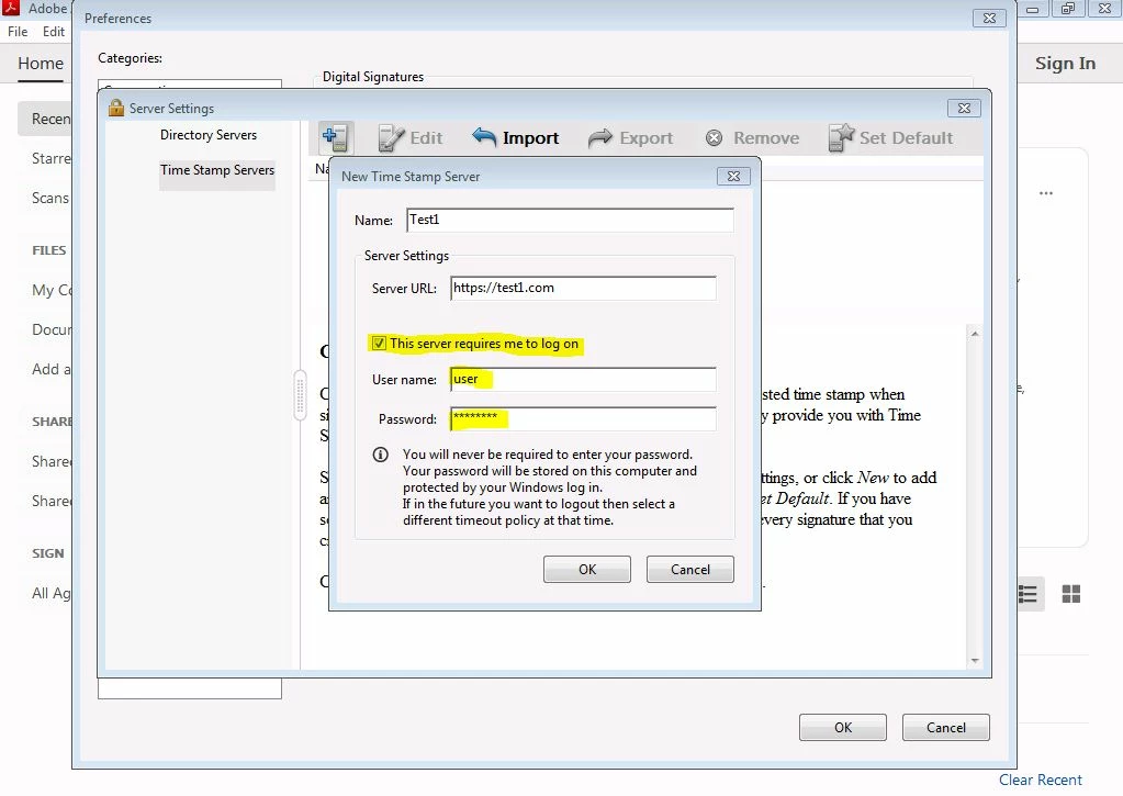 I have a problem with create application package in SCCM including TimeStamp log on Configuration. This option is configurate in Edit\Preferences\Signatures\Configure Timestamp Server Settings\Time Stamp Servers\New I found this configuration in windows registry in Komputer\HKEY_CURRENT_USER\Software\Adobe\Acrobat Reader\DC\Security\cPPKHandler\cTimeStampServers\c0 key. When I copied it to another machine I have TimeStamp server properties correctly, but creditionals fields are empty. I marked on attachment what options don't migrate: