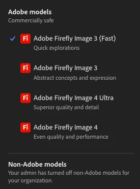 Once signed in, please check under General settings > Model dropdown menu. Under the Non-Adobe models section, do you see the message stating, “Your admin has turned off non-Adobe models for your organization”? If yes, please share a screenshot for review.