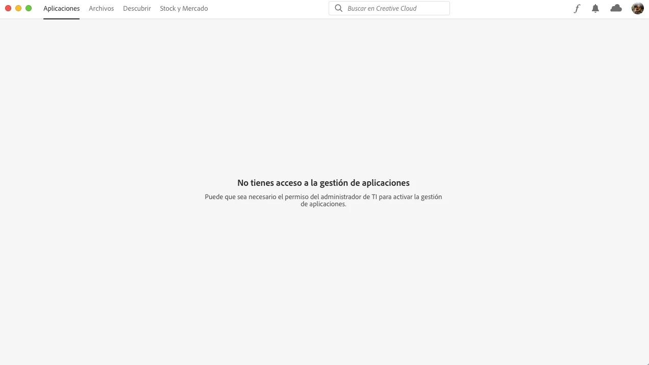 Buen día, no puedo instalar las aplicaciones, me aparece que no tengo acceso a la gestion de aplicaciónes en creative cloud, y que es necesario el permiso de "TI" para poder activarlo.