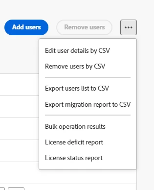 I have set up Azure Sync for my Adobe for Enterprise organization. I have a few test users with existing Adobe IDs now synchronized to the Adobe Admin Console with Federated IDs. I am looking for the option in Users to "Edit identity type by CSV." However, I don't see this option in the dropdown list. This is what I am seeing: