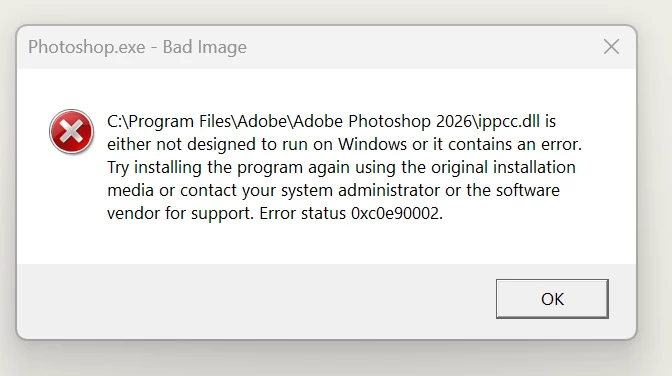 Photoshop 2026 V27.0 can't start - dll errors on Windows 11 (Team Membership)