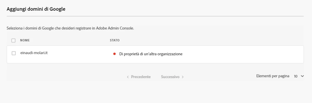 I've followed all the step in the guide provided by Adobe : I've created the directory, created the SAML app in the Google Admin Console, now I have to add the domain to the directory but when it's time to select the domain to add I can't select it and there's an error message saying "Property of another organization" (original error message in the image attached) and I can't really figure out the meaning of this error message, can anyone please help me?