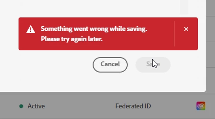 So i went to add an adobe user like i have many times before. Put in their email, they are federeated and detected as such. Then i try and click add and today it says "something went wrong while saving".