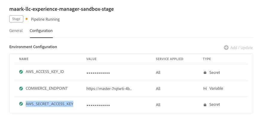 I am trying to securely store the AWS_ACCESS_KEY_ID and AWS_SECRET_ACCESS_KEY in order to upload some report html files to a s3 bucket as a postbuild action after executing the UI tests (Custom UI Testing pipeline step). I have added them as secrets at the environment level as per the official documentation: https://experienceleague.adobe.com/docs/experience-manager-cloud-service/content/implementing/using-cloud-manager/environment-variables.html?lang=en .
