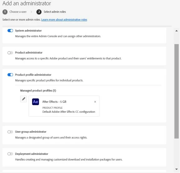 We have reviewed the account you used to post here and found that you currently use a Teams Subscription. The Administrative roles you are trying to assign are a part of the Enterprise plan only. In a Creative Cloud Teams plan, there can only be two types of Admin: Contract Owner and System Admin.
